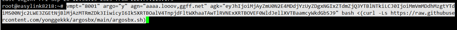1 | vmpt=“” argo=“y” agn=“” agk=“” bash <(curl -Ls https://raw.githubusercontent.com/yonggekkk/argosbx/main/argosbx.sh) |